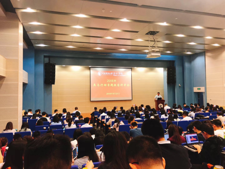 2018年9月21日,天津农学院18级会计专硕27位同学在李艳萍老师的组织下、班长钟树旺的带领下,集体到中央财经大学学术会堂402报告厅观摩了2018年度“奥马行动”专题项目评审报告会。“奥马行动”是管理会计行动学习,经过前期的两轮评审,38个团队中有6个团队的项目进入了最终的评审环节。