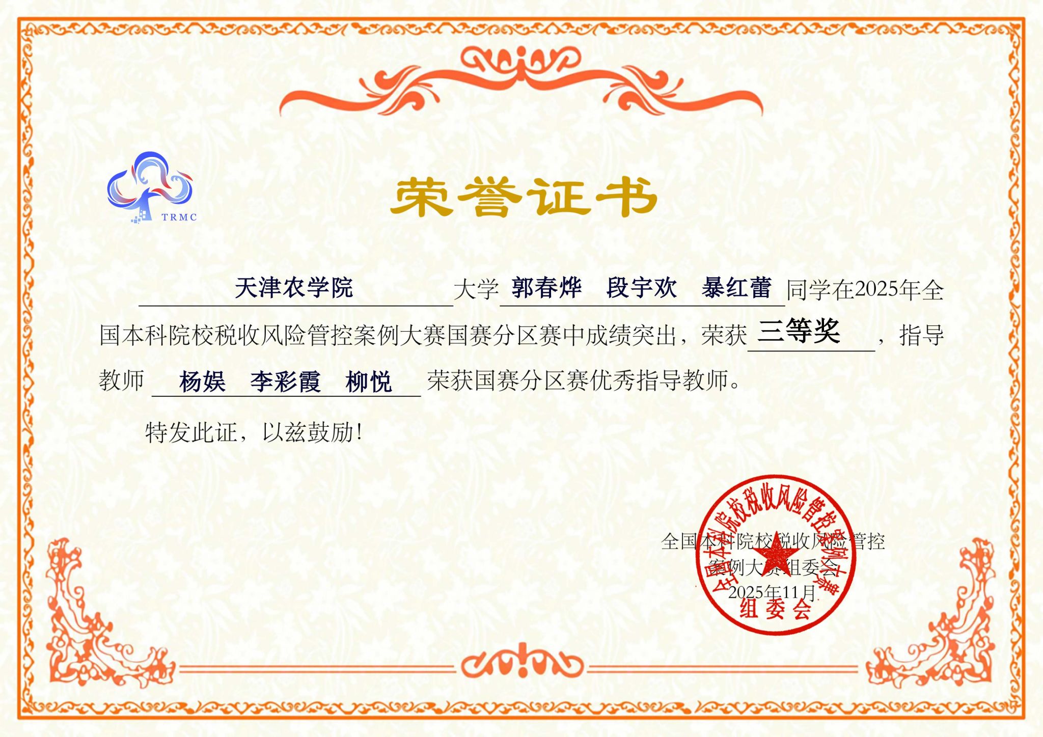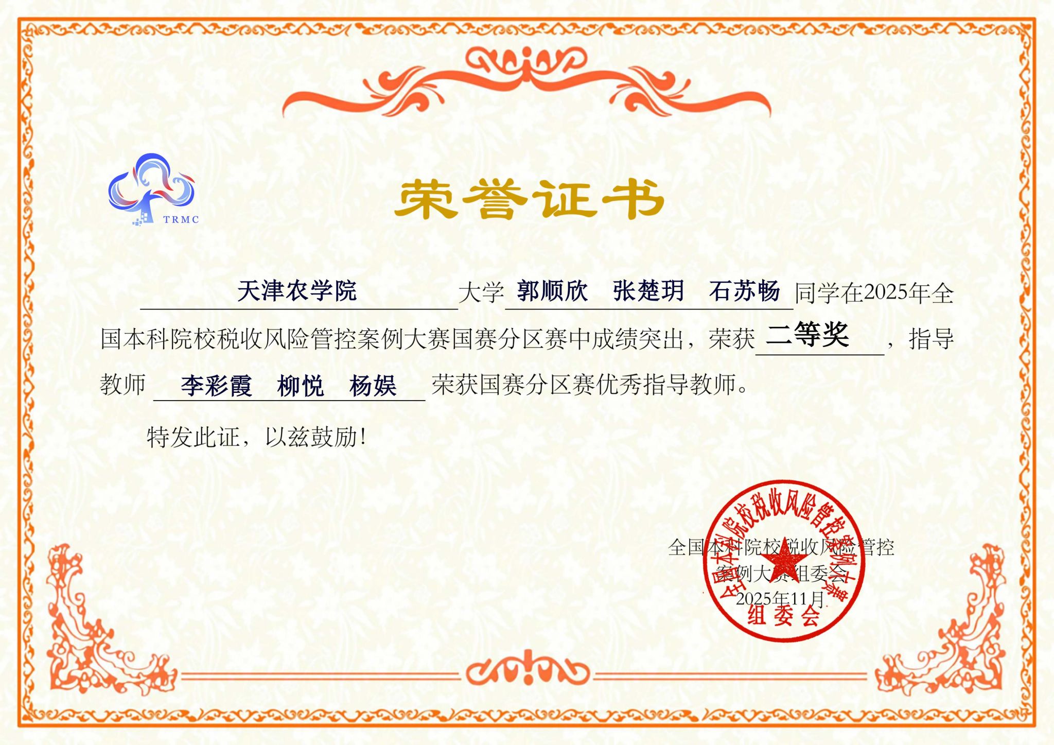 近日,2025年全国本科院校税收风险管控案例大赛天津市分区赛成功举办。竞赛由全国本科院校税收风险管控案例大赛组委会主办,全国税务专业学位研究生教育指导委员会指导,天津财经大学财税与公共管理学院承办。